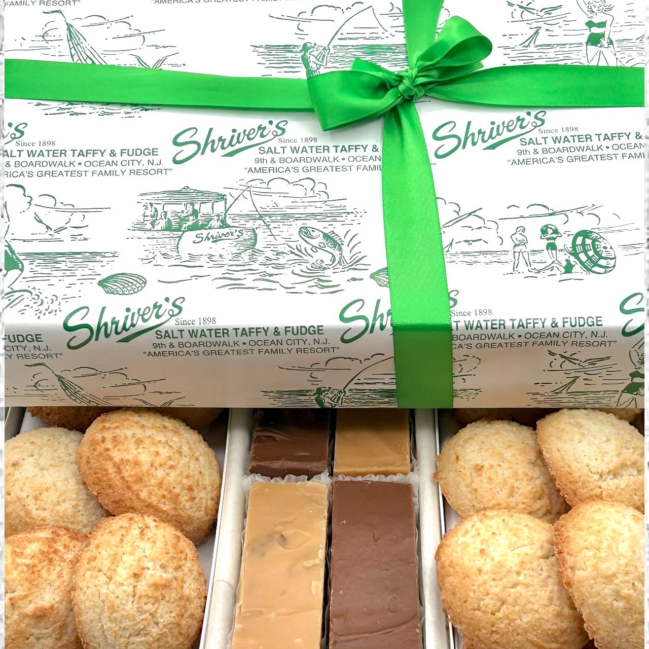 This box is full of homemade delight. Six moist, delicious coconut or almond macaroons baked to perfection coupled with four bars of our creamy fudge. 1 lb. Fudge (vanilla, vanilla nut, chocolate, chocolate nut) 6 Macaroons