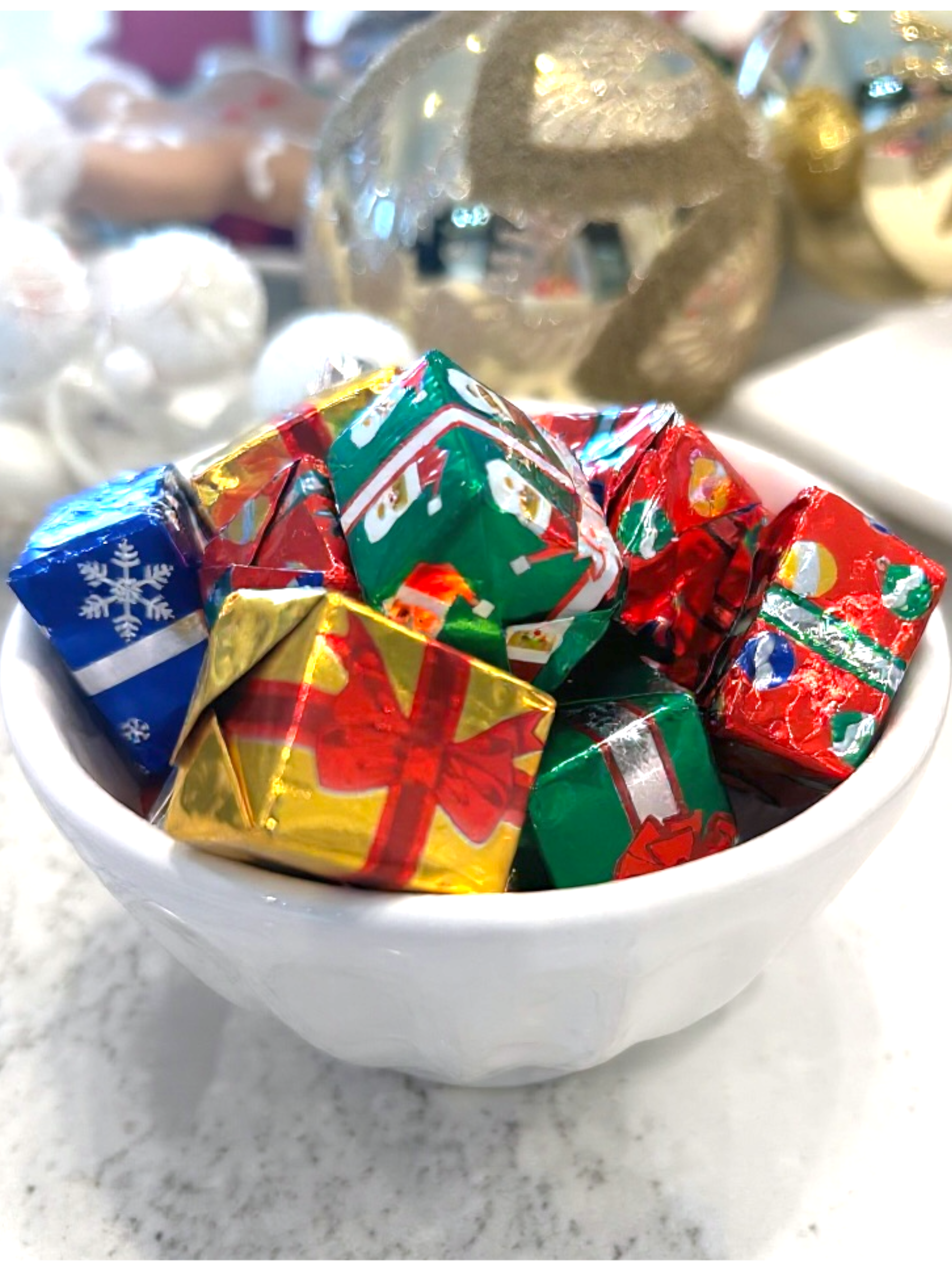 What is a better gift to unwrap than a foil wrapped present filled with creamy milk chocolate? Fill your favorite holiday bowl, or drop in their stocking to sweeten up the sock. One pound foil wrapped presents