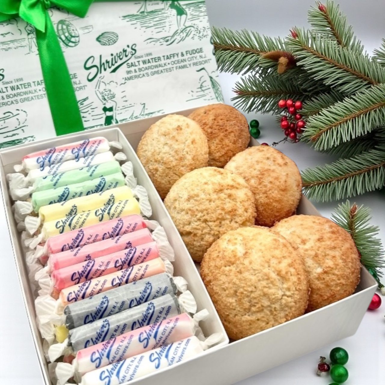 The Salt Water Taffy & Macaroons Combination is sure to give you a taste of the town with six mouth-watering macaroons and one pound of our traditional salt water taffy flavors. Your choice of either almond or coconut macaroons. 6 Macaroons 1 lb Salt Water Taffy Sorry, no flavor substitutions on the salt water taffy.